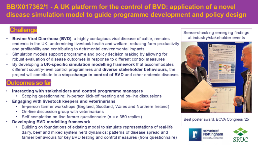 The simulation model will be developed to model the status of each animal, including characteristics of immune status (susceptible, exposed/immune) and infection status. We will incorporate this model with an existing simulation model of a whole cattle farm linked to a holistic environmental life-cycle analysis model, REMEDY. Existing test databases will be used to define UK spatial and temporal patterns of BVD and the key epidemiological and spatial parameters to use within the simulation model to represent BVD. To establish a model of between farm spread we will use machine learning methods to create a new classification system for UK cattle farms, based on the herd demographics, spatial and movement data. This will allow a more detailed reflection of the diversity within the UK’s farming population and use the newly defined classification system to simulate the trade if cattle across the networks of UK farms. The within-farm infectious disease model and the network simulation models will be combined with the analysis of the test data to create a UK wide national infectious disease simulation model of BVD. A co-design process with stakeholders will be used define current BVD control programmes and future alternative scenarios of interest and define their goals and behaviours relevant to BVD control. The scenarios defined by the stakeholders will be simulated and multiple aspects of the outcomes evaluated, including epidemiological, economic, and environmental components. The results will be presented to stakeholders and the model evaluated on the model’s ability to produce informative and impactful outputs capable of influencing stakeholder behaviour and shape future endemic disease eradication programmes.