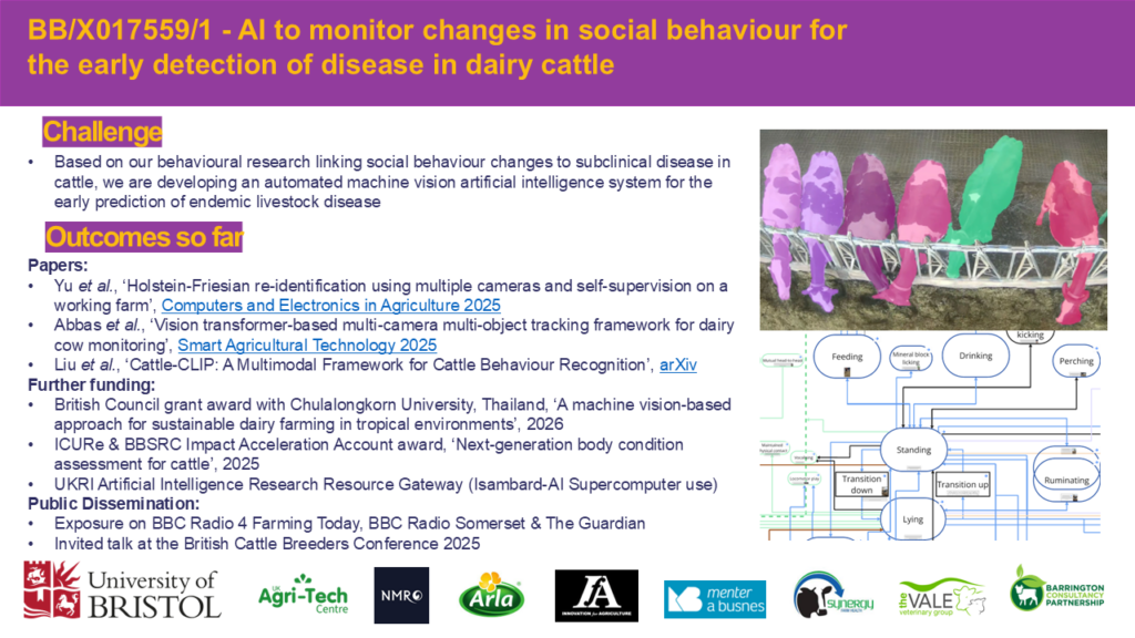 Detecting social behaviour changes is difficult for the busy farmer, but is possible by monitoring them at key focal points, such as when queueing for milking or feeding at the feed bunk, using video cameras and artificial intelligence (AI). We have developed highly robust AI that can track the motion of cows in video and recognises each individual through their distinctive coat pattern. Others have now demonstrated good classification of affiliative and agonistic social interactions from video and hence we now propose combining the two ideas to track changes in activities and social behaviours over time for each identified cow in a herd. From collecting two years of video from 64 cameras covering the main barn at our John Oldacre Centre dairy farm, we will train a model that learns what types of behaviours change over time that are indicative of different early stage diseases. We will focus on mastitis and lameness, as these diseases have the greatest incidence in our data and are the most important for the UK dairy industry. At the same time, we will sample the saliva of a subset of our herd so we can determine general levels of inflammation, enabling us to see how specific our behavioural predictors are to particular diseases.