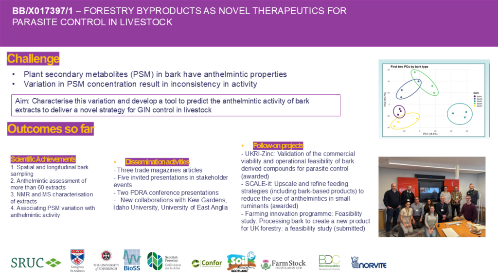 The exact PSM content, concentration and structure in a bark extract directly affects the extract’s biological activity and these factors depend on environmental conditions, including geographical location of the source wood and herbivory patterns11. To date, incorporation of PSM-rich extracts for parasite control has been hampered by this variation in PSM content, which results in variation in biological activity and thus inconsistency of effect. The delivery of a tool that can assess the anthelmintic potential of bark extracts will address this inconsistency. Once complete, this project will allow the creation of a realistic strategy for an integrated biorefinery based on the use of bark that can be applied on an industrial scale, to contribute to parasite control in livestock. This development will benefit two key UK industries, forestry and livestock production, addressing and solving significant challenges.