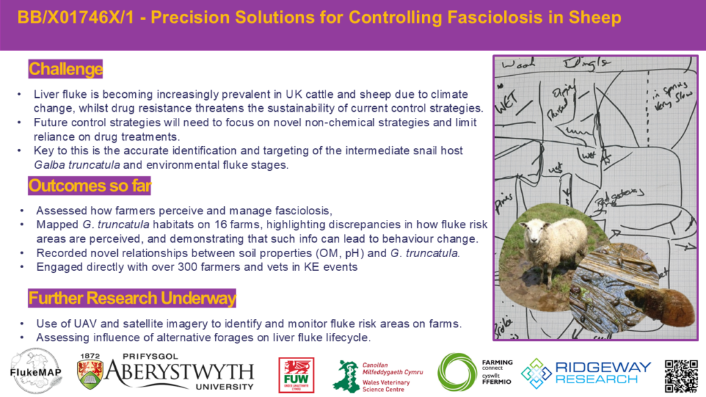 This project will develop fundamental knowledge and new solutions for the Precise Control of Fasciolosis in Sheep by developing and deploying within farm-level environmental DNA and proteomic tools that determine environmental risk areas for fasciolosis. The project will also identify fluke infection indicators from animal-based performance and behaviour measures. The project aims to revolutionise the ability of sheep farmers to accurately treat acute fasciolosis by identifying areas of hazard on pasture, develop tools to determine which animals need treatment and facilitate the optimal use of anthelmintic control options to protect animal health and welfare whilst maximising performance. The project will directly engage and collaborate with farmers and veterinarians, to explore novel practice-based approaches for fasciolosis control and treatment and to build a knowledge exchange programme driven by the identification of farmer knowledge gaps. Our work will also enhance our fundamental understanding of Galba Truncatula ecology and fasciolosis epidemiology, diseased animal behaviour and between-life stage parasite protein biomarkers. These enhancements can drive further multidisciplinary research across a wide array of fields.