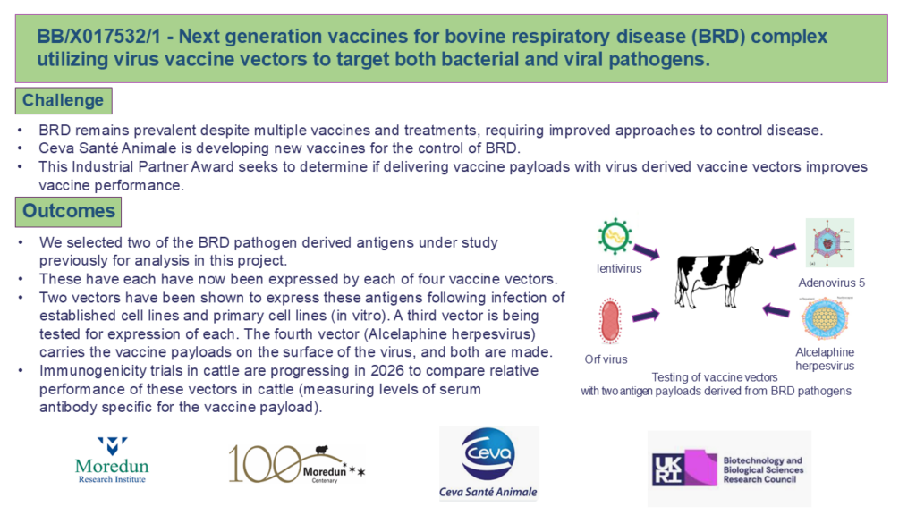 At Moredun, we have developed vaccine vectors to deliver antigen payloads from the virus pathogens involved in BRD using four platforms. In this proposal, we have selected one protein from a bacterium, and one protein from a virus involved in BRD to compare our vaccine platforms. These will both be cloned into each of the vectors under study, specifically, replication defective human adenovirus 5 (Ad5), Maedi visna virus (MV), Alcelaphine herpesvirus 1 (AlHV-1), and Orf virus. All vaccine vectors we produce, expressing the targeted antigens, will be tested in vitro as a pre-screen before conducting animal trials. If, as expected, all express the protein payload in vitro, they will be tested in cattle. We will assay for serum antibody responses, mucosal antibody responses, and the comparative levels of CD4 T helper cell responses. There are no reports to date of direct comparison of different viral vaccine vectors delivering the same payload.