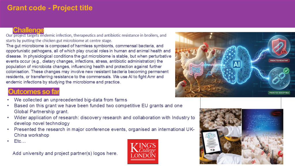 Diseases caused by pathogenic bacteria, viruses and parasites are among the most significant threats to poultry industry productivity, causing considerable economic losses every year. The use of antibiotics as therapeutics is often pursued without a clear understanding of the actual cause of the diseases, leading to a worrying growth of antimicrobial resistance (AMR) in pathogens, with potentially harmful ramifications for public health. The project aims at developing new surveillance solutions for the broiler industry, to detect infection, diagnose infection type (bacterial strain, virus, parasite or combination), suggest treatment, and detect presence of AMR. These solutions will be comprised of protocols for collecting data on the farm and sending it to the cloud where surveillance software will automatically perform periodic assessment, returning information back to the farmers through dedicated apps running on smartphones/tablets.