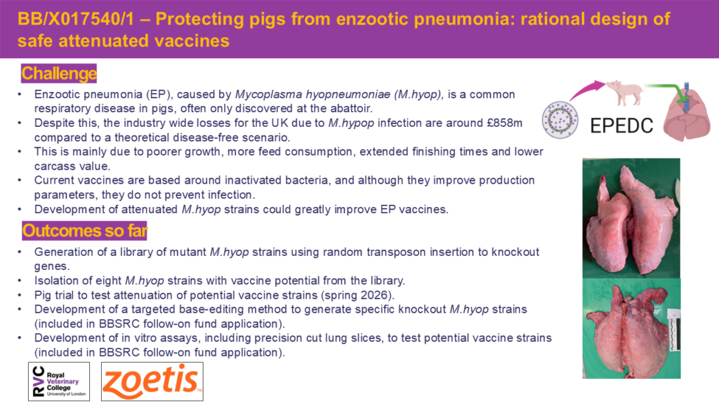Mycoplasma hyopneumonia (M.hyop) is the primary pathogen of enzootic pneumonia (EP), a chronic respiratory disease in pigs. Infections occur worldwide and cause major economic losses to the pig industry, thus having a significant socio-economic impact on pig farmers. Close contact between infected and susceptible pigs is the main route of M.hyop transmission. Piglets are considered free from M.hyop at birth, as in utero transmission has not been documented, and first exposure events occur during the lactation period, when piglets are in contact with dams shedding the microorganism. In fact, the length of the lactation period has been suggested as one risk factor for piglet colonization with M.hyop prior to weaning, and given that the prevalence of M.hyop is around 30%, this places piglets under an enormous risk to be infected. Unfortunately, there are currently no commercial vaccines available that would prevent this initial infection. Indeed, piglet colonization with M.hyop at weaning age is of special importance in segregated production systems, where pigs are transferred to clean facilities for the growing and finishing phases. It has been proposed that the initial group colonisation with M.Hyop determines downstream clinical presentation and disease severity, which is further impacted by the long duration of M.hyop infection that can reach up to 240 days as well as the ability to be infective even after wind dispersal (as far as 9.2km from an infected farm). Thus, an interruption of the colonisation cycle through effective vaccines will benefit the whole porcine production system. M.hyop is primarily found on the mucosal surface of the trachea, bronchi and bronchioles, with different adhesins and lipoproteins being involved in the adherence process, thus rendering infected animals more susceptible to secondary infections. Specifically, the destruction of the mucociliary apparatus, together with the ability of M.hyop to module the immune response, enhances the susceptibility of infected pigs to secondary pathogens. Whereas M.hyop is still susceptible to a variety of antibiotics, their use needs to be reduced to avoid occurrence of multi-drug resistant strains as well as the general drive to reduce antimicrobial usage. Current available vaccines are often cost-efficient but mainly consist of inactivated vaccines which improve production parameters but do not prevent infection or spread of the pathogen, and their use is often limited to one age group, i.e. sows or piglets after 3 weeks of age. Thus, research on developing new vaccines that confer protective immunity and reduce transmission is a priority, as well as optimization of protocols to eliminate M.hyop from pig herds. Here, we are aiming to produce strains of bacteria which are unable to cause disease in pigs but still stimulate a protective immune response. This work builds on previous BBSRC-funded work identifying genes which are essential for survival of the pathogen in pigs and AHDB funded work to isolate strains of bacteria from UK pigs. Once complete, the project will have discovered bacterial genes that are necessary for disease as a basis for the development of better vaccines to prevent, and prevent the circulation of, enzootic pneumonia.