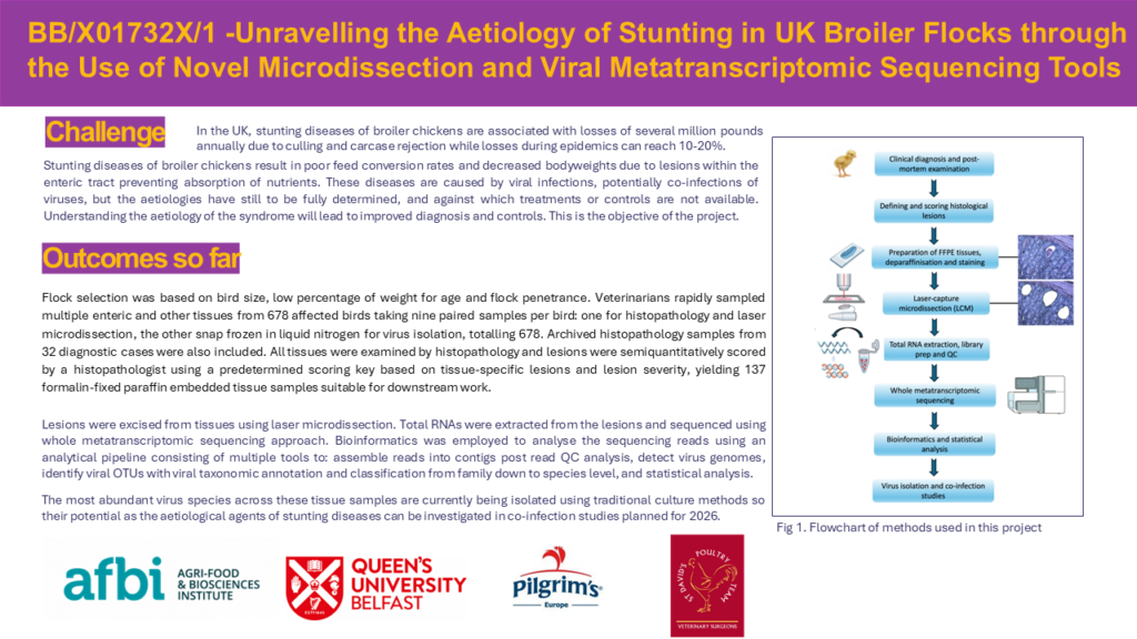 The challenge addressed by this project is to unravel the causes of stunting disease in UK broiler chickens. Stunting syndrome has been a production issue in commercial broiler flocks since they became industrialised after the second world war, but is also a problem for small producers in low and middle income countries, such as Nigeria, where women often raise small numbers of chickens to supplement the family income. The stunting problem has many names, including infectious stunting, runting stunting syndrome and malabsorption disease. It pertains to a failure to grow properly despite sufficient feed. Birds typically present with stunting problems around the second to third week post hatching, but clinical signs may be observable earlier. As well as the reduction in weight gain, which can be substantial with severely affected chickens only a fraction of their potential weight for age, there may be other signs such as altered appetite, watery droppings, abnormal feathering and enteritis. We and other groups have evidence that the stunting is caused by infectious agents: chiefly, viral aetiology is suspected and experimental infections at AFBI using specific strains of the endemic, enteric viruses, astroviruses and reoviruses separately have resulted in some of the signs observed during stunting, e.g., weight loss or lesions in the gut mucosa. Other groups have also demonstrated some of the signs of stunting from inoculating birds with single viral strains of these and other viral candidates, e.g., birnavirus; however, none have fully recreated the stunting syndrome, and co-infections with more than one viral agent are considered the more probable aetiology. Moreover, diverse strains of these viruses are in circulation which are known to vary widely in pathogenicity with the majority potentially of low or no pathogenicity and accordingly high levels of these virus may be detected in young, healthy, unaffected birds.